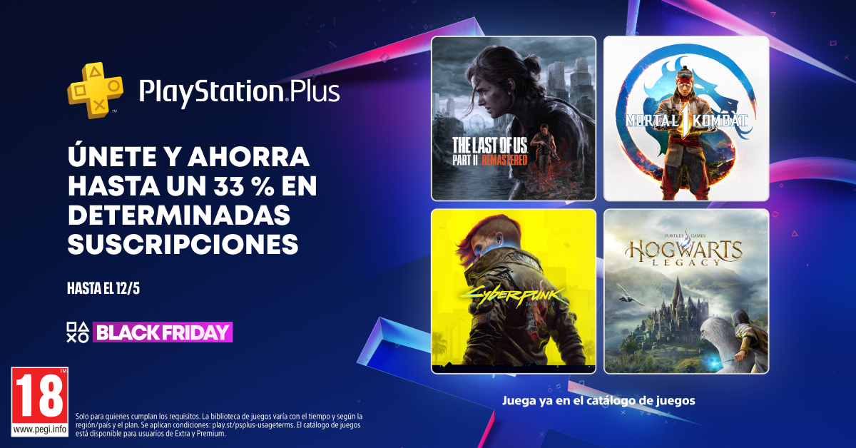 Los jugadores de países participantes que se unan a PlayStation Plus durante el periodo promocional del Black Friday de PlayStation podrán ahorrar hasta un 33 % en una suscripción de 12 meses. Los miembros actuales de PlayStation Plus podrán ahorrar un 33 % en el resto de su periodo de suscripción al mejorar su plan PlayStation Plus Essential o Extra a Premium.