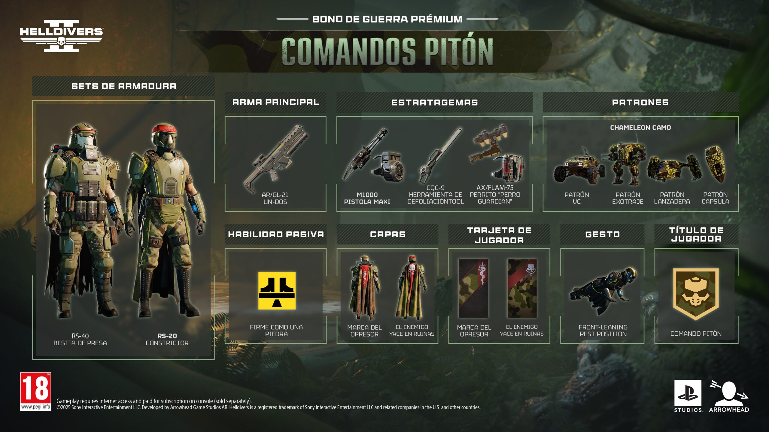 Los Helldivers, altos cargos del Ministerio de Defensa os han acusado de ser los mejores. Y, si sois los mejores, necesitaréis el mejor equipo. Por eso el ministerio ha acelerado el despliegue del bono de guerra premium Comandos Pitón*, ¡que llegará a vuestros Superdestructores el 2 de diciembre!